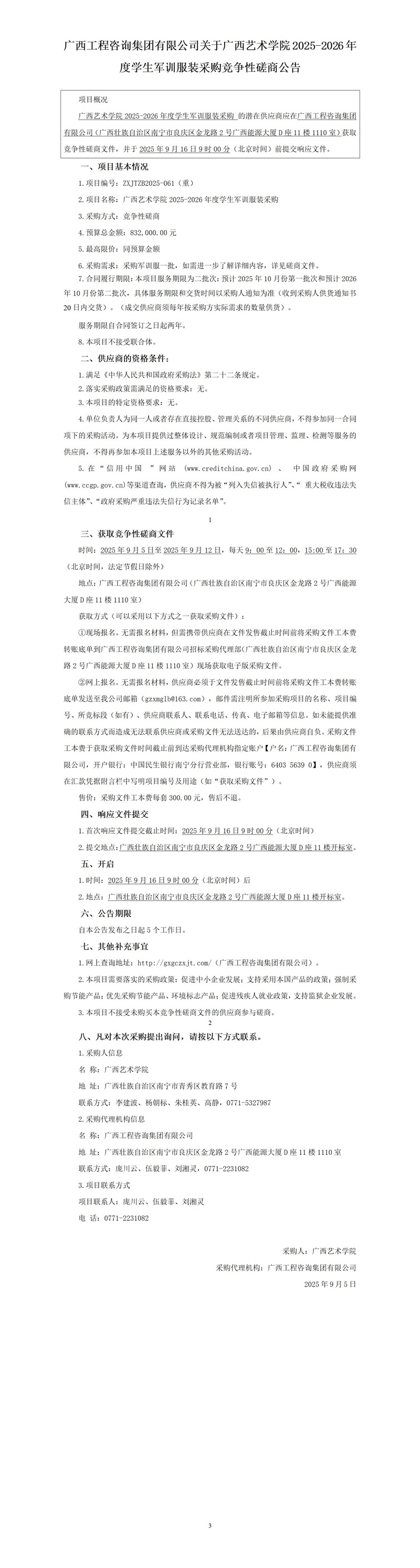 mile米乐集团有限公司关于广西艺术学院2025-2026年度学生军训服装采购竞争性磋商公告