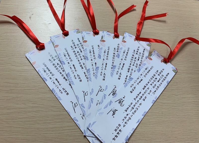 公司党委书记、董事长、总经理庞汉为活动纪念品定制版书签写寄语