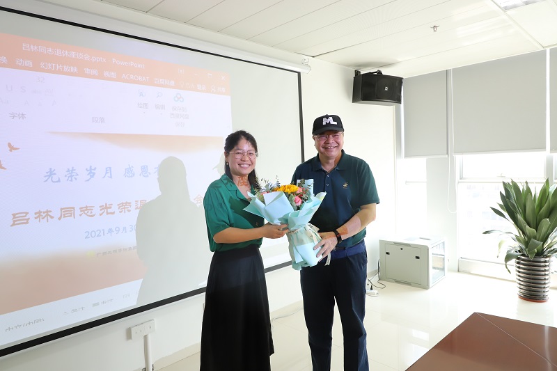 莫道桑榆晚,为霞尚满天。9月30日上午,公司举办资深业务经理吕林同志的退休座谈会。公司党委书记、董事长、总经理庞汉,党委副书记、工会主席左俊兰,副总经理卢德冠,副总经理黄灿辉,总工程师王丰赞及相关部门负责人齐聚一堂,欢叙畅谈,以最真挚的情谊祝贺吕林同志光荣退休。