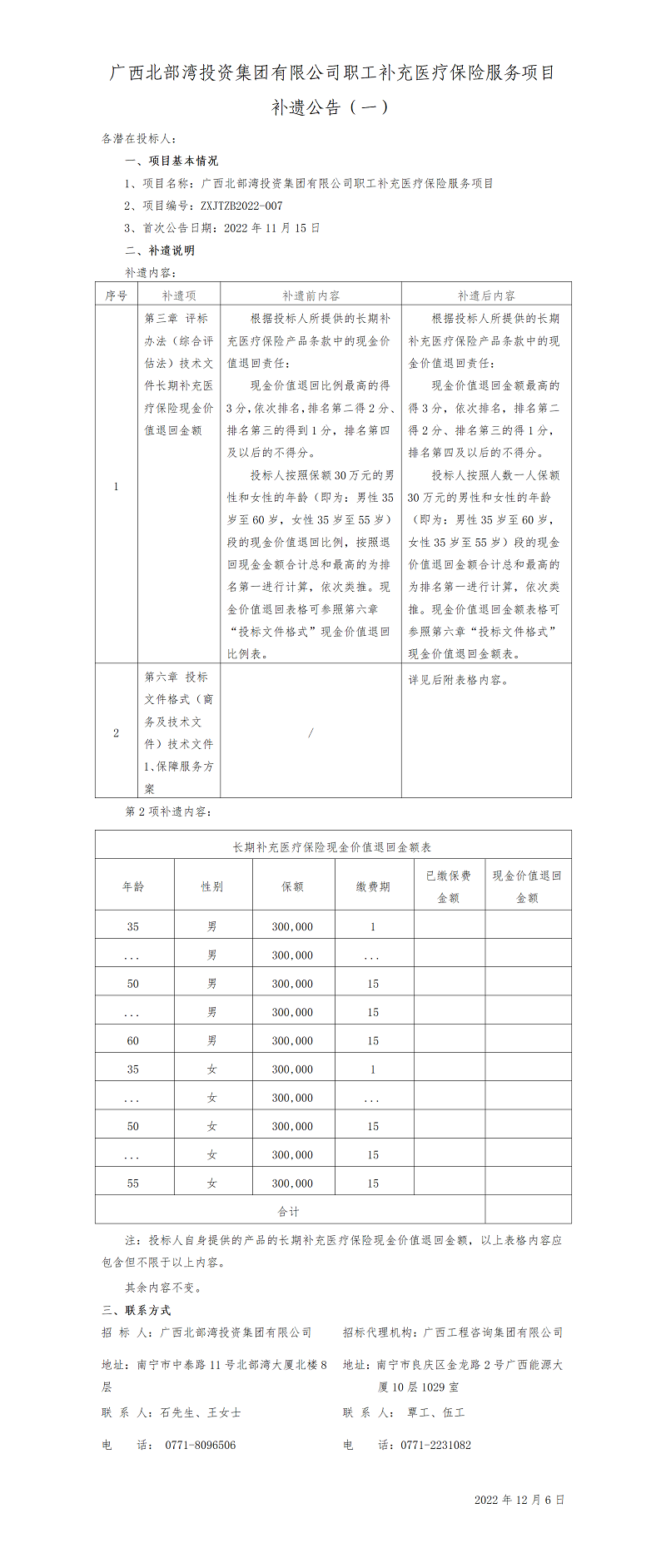 广西北部湾投资集团有限公司职工补充医疗保险服务项目补遗公告(一)