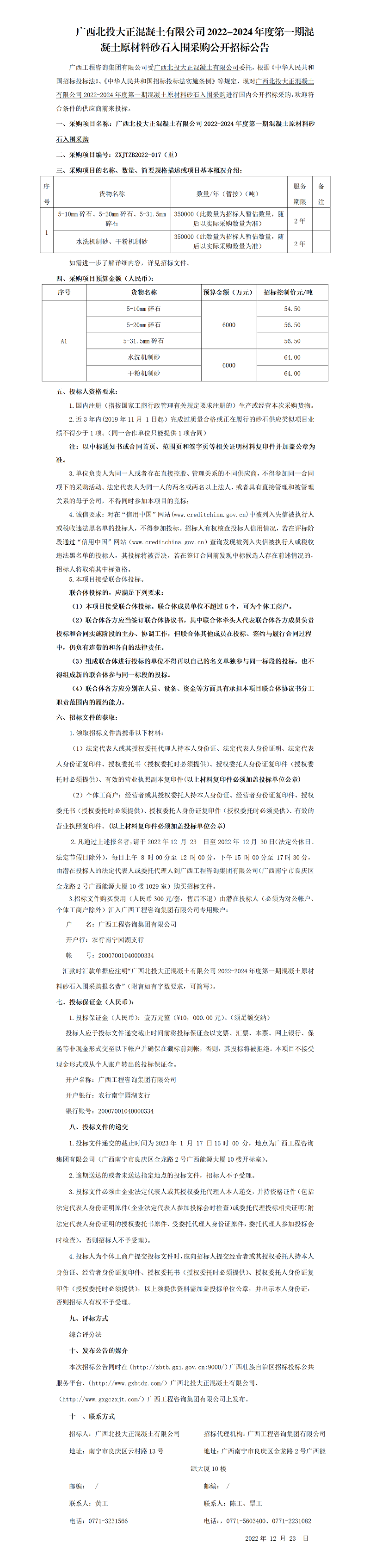 广西北投大正混凝土有限公司2022-2024年度第一期混凝土原材料砂石入围采购公开招标公告