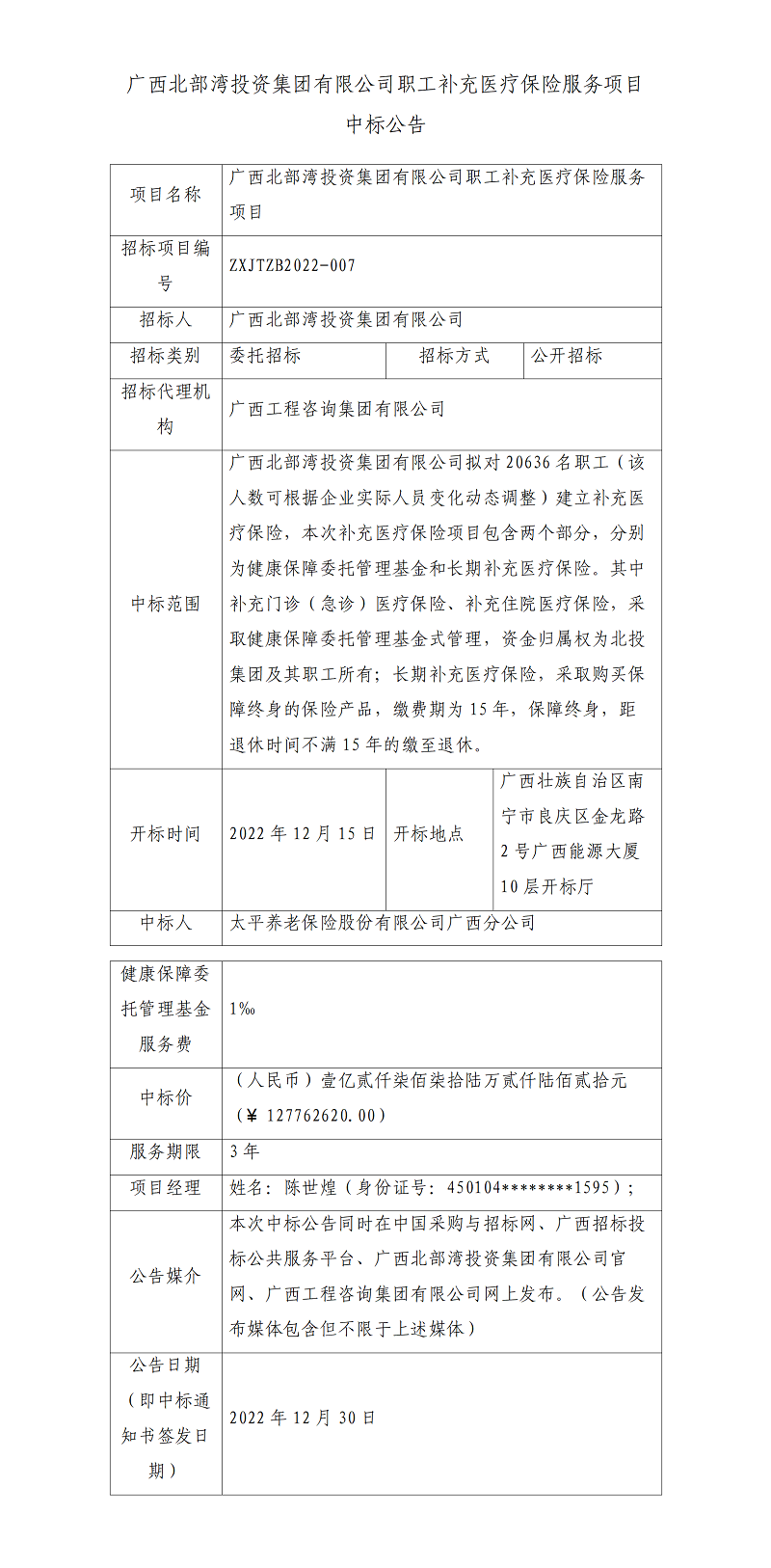 广西北部湾投资集团有限公司职工补充医疗保险服务项目中标公告