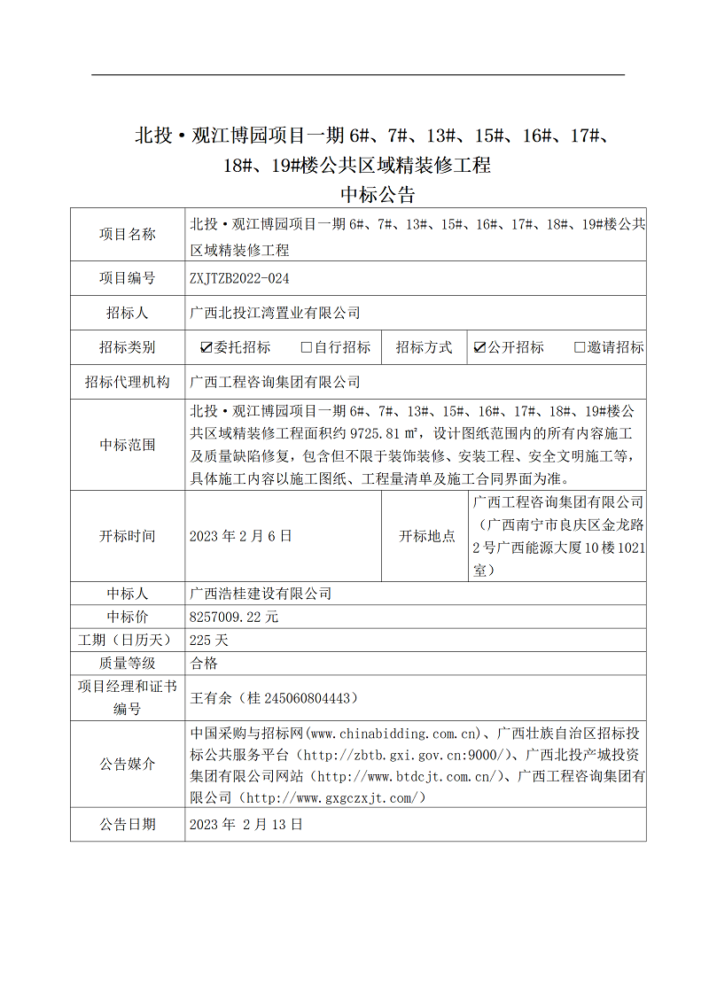 北投·观江博园项目一期6#、7#、13#、15#、16#、17#、18#、19#楼公共区域精装修工程中标公告