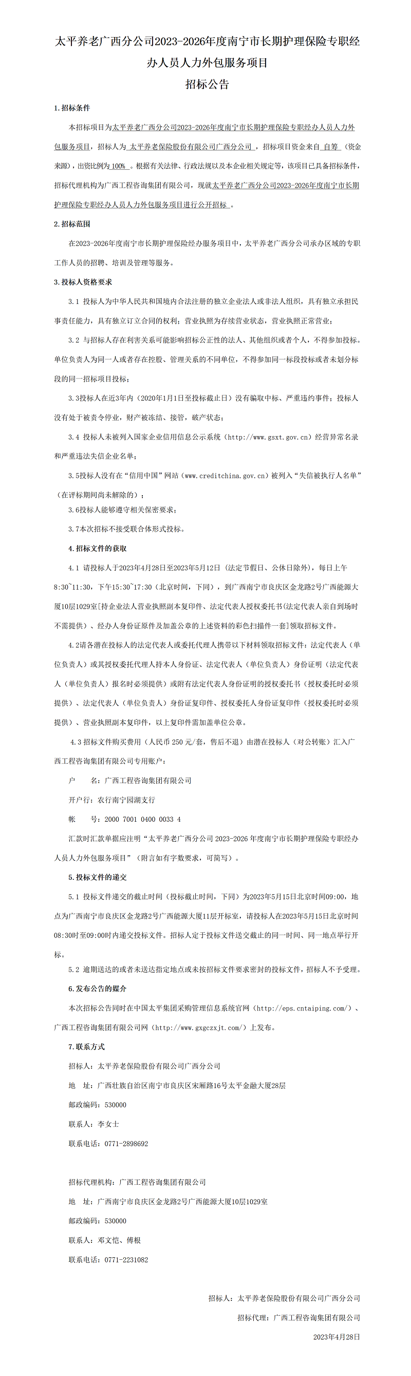太平养老广西分公司2023-2026年度南宁市长期护理保险专职经办人员人力外包服务项目招标公告