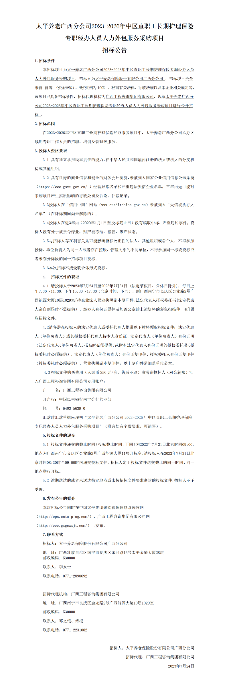 太平养老广西分公司2023-2026年中区直职工长期护理保险专职经办人员人力外包服务采购项目招标公告