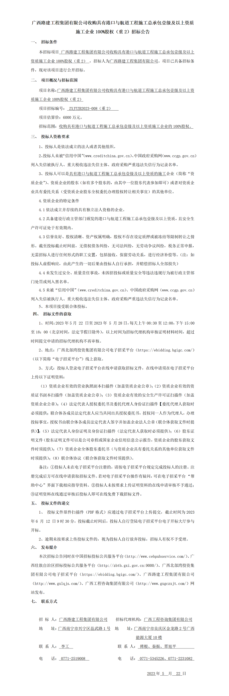 广西路建工程集团有限公司收购具有港口与航道工程施工总承包壹级及以上资质施工企业100%股权(重2)招标公告